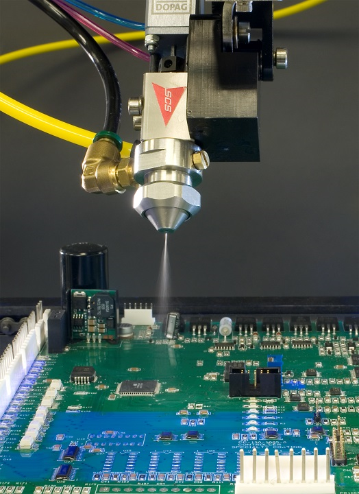 | The SCS Precisioncoat V’s conformal coating and dispense valves move smoothly along the three axis system, with an option to add fully programmable fourth and fifth axes for tilt and rotation capabilities. The system’s multi-valve technology allows for the application of dots, lines, fills, glob tops and spray coat areas. The redesigned Precisioncoat provides more than a dependable layer of protection, it is a total system solution that ensures accuracy, repeatability and high throughput for a wide range of automated material application, all in a smaller footprint to maximize valuable production floor space.